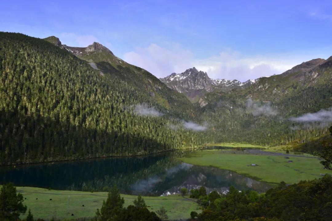 ▲措姆湖远眺亚丁三神山
