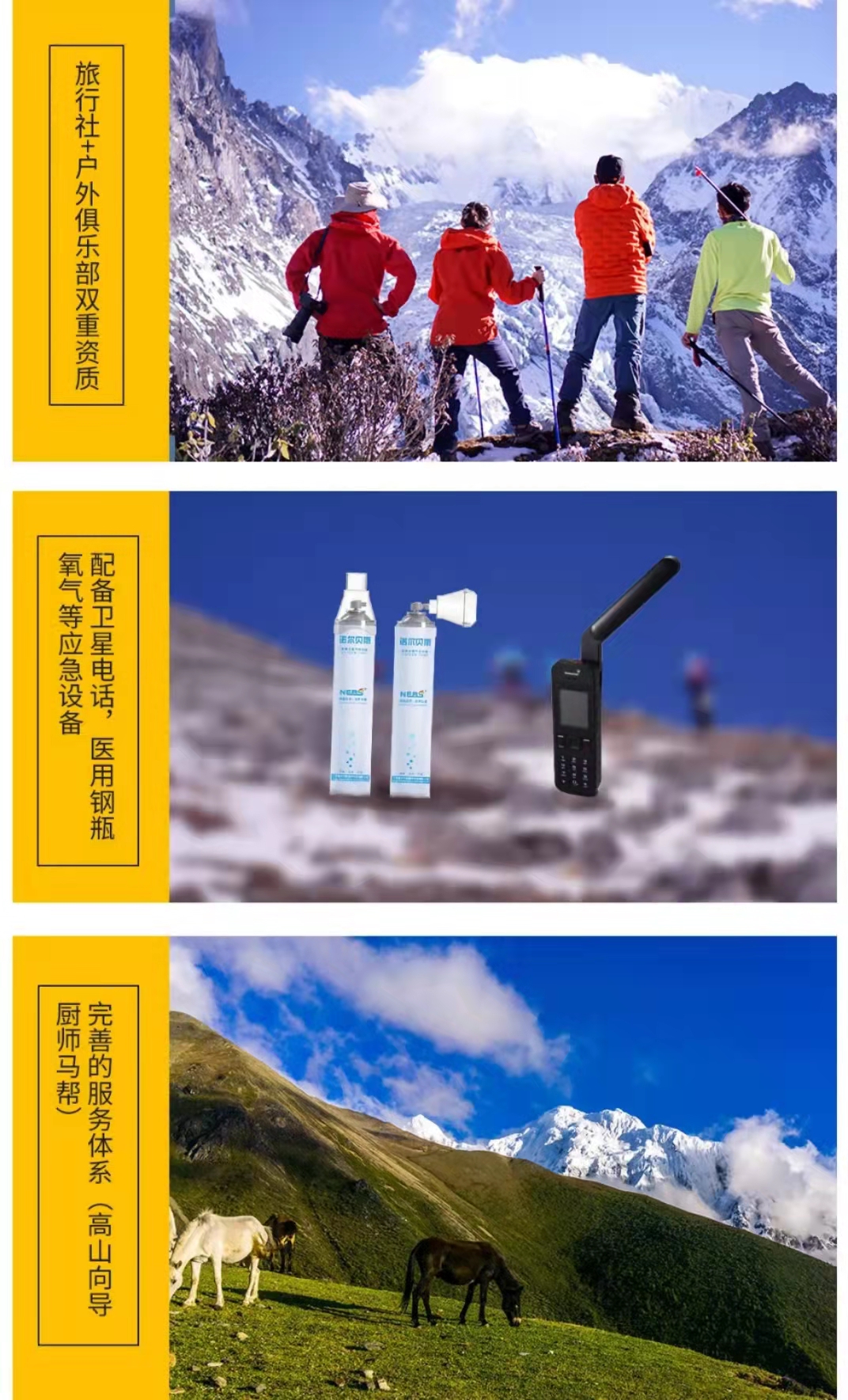 行程配备当地高山向导、专业户外领队、高山厨师、后勤保障,不低于1:10配比。让你的旅行后顾无忧。